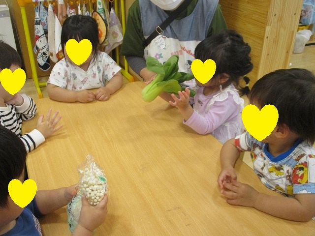 4月23日(木)の食育は「やさいにふれよう」で青梗菜、えのき、人参、ジャガイモ、ピーマンとたくさんの野菜に触れました。2歳児クラスのこあら組では匂いを嗅いでみたり、触ってみたり野菜と友だちになりました。