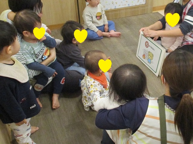 4月23日(木)の地震の避難訓練はお部屋で行いました。1歳児クラスのうさぎぐみではみんなでダンゴムシになって隠れました。その後に「おかしもち」の話をイラストを見せながら安全に避難する時の約束を話しました。おかしもちとは「押さない」「駆けない」「喋らない」「戻らない」「近づかない」の頭文字を取った言葉です。