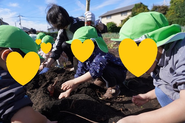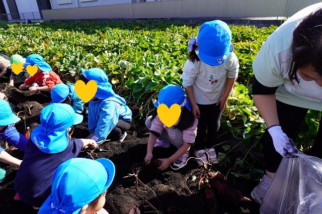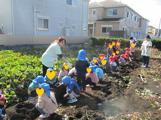 「ここにもあるよ~」「どこどこ~?」みんなで協力してお芋を掘ります。