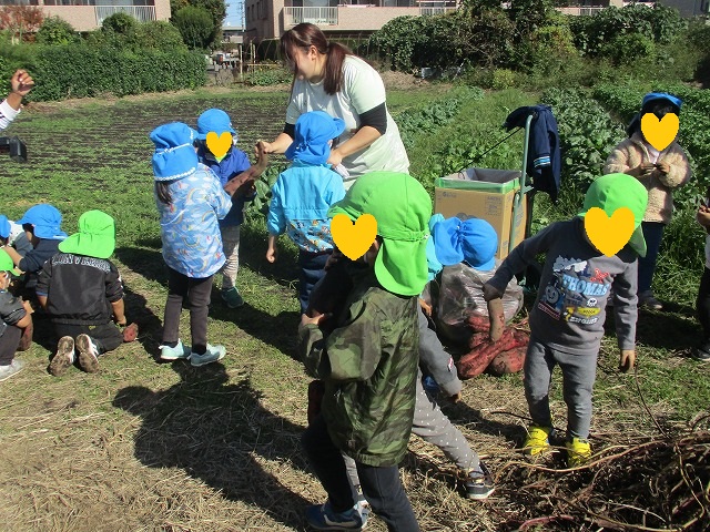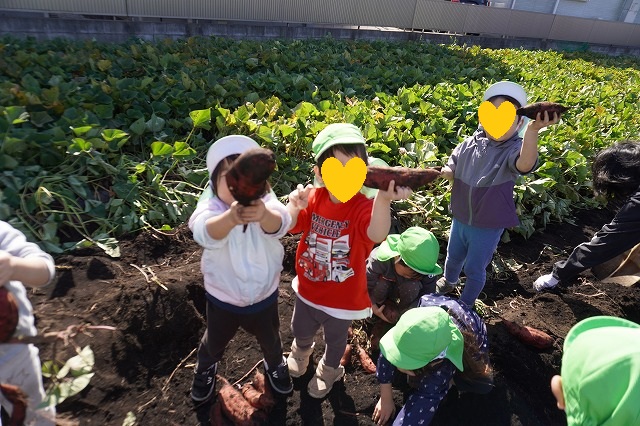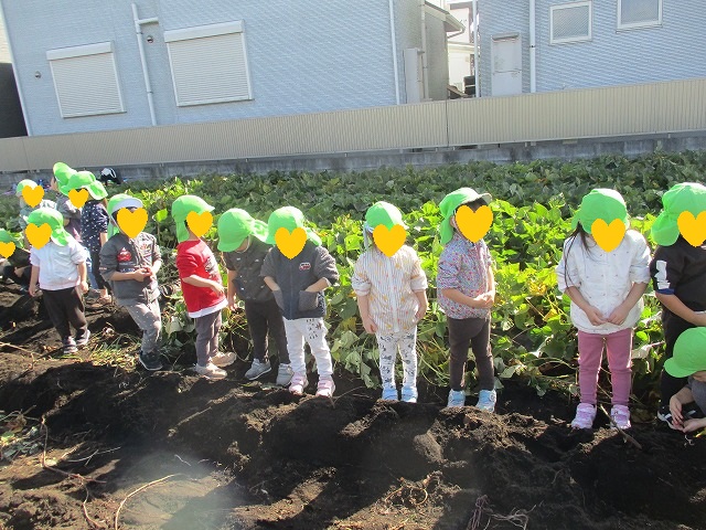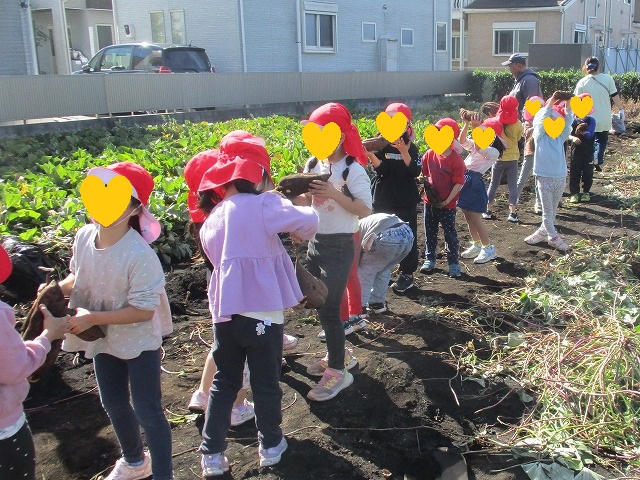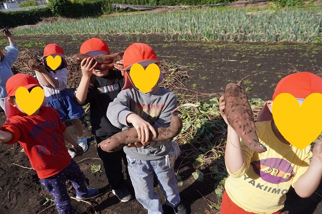 今年のお芋はでぶっちょいもがいっぱいあって豊作でした。みんなでお芋を持ち上げ「見てみておおきいよ~」と歓声が聞こえました。