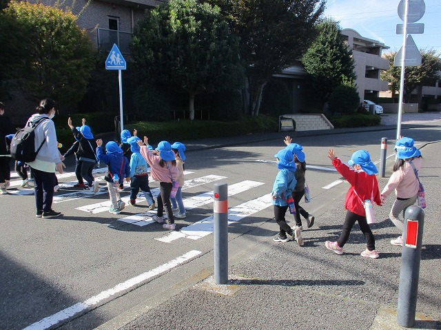 11月4日(火)秋晴れの気持ちの良い天気の中、芋ほりに出発です。幼児クラス3クラス合同で歩いて山田さんの芋畑に向かいます。