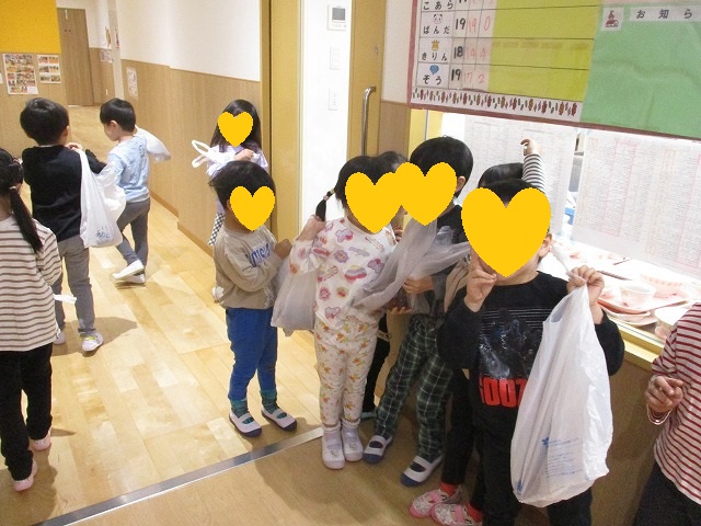 取ったお芋は保育園のベランダに並べました。子どもたちは好きなお芋を選んで持って帰ります。お留守番だった乳児クラスさんにもおすそ分けをしました。