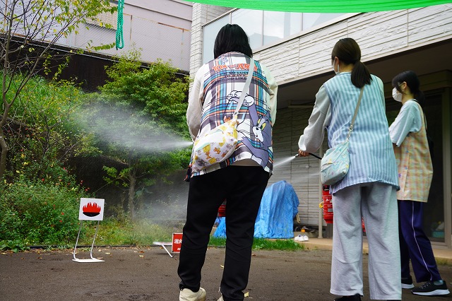 先生たちが水消火器で、火事を消しました。子どもたちは「がんばれ~がんばれ~」の声援です。