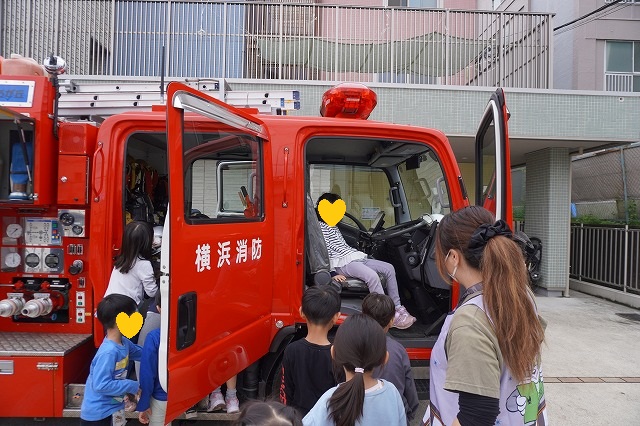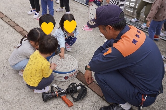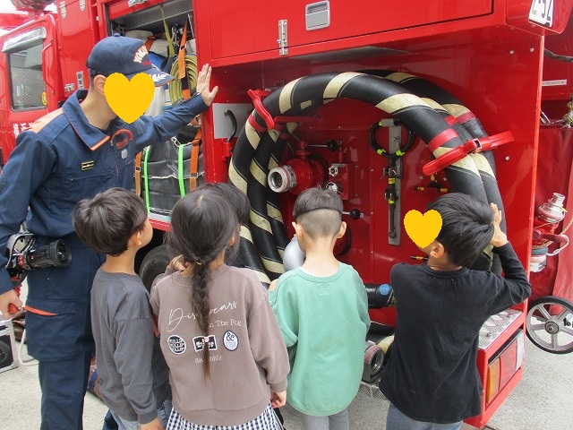 最後は消防車見学です。「これなあに?」「火事を消すホースだよ」と声が聞こえてきそうです。