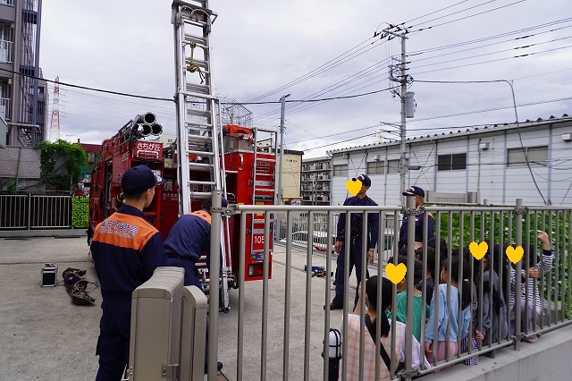 消防車のはしごを伸ばしてもらい、みんなで「すご~い」と興味津々です