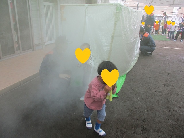 防災教室が終わった後、園庭で煙体験をしました。身体を低くして口にタオルを当てて、素早く非難していきます。