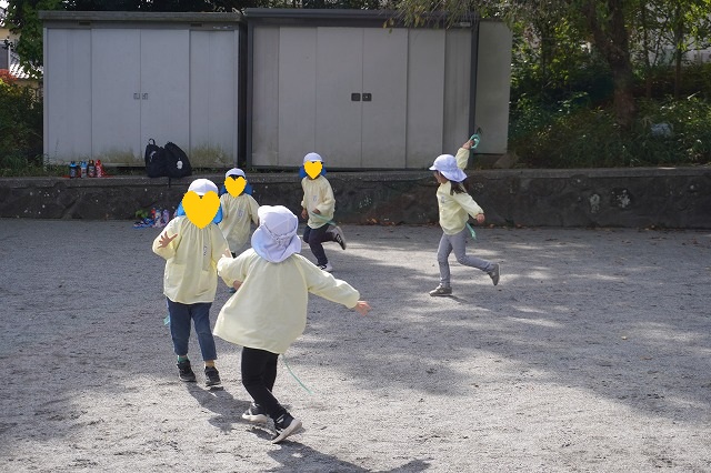 しっぽ取りゲームが始まりました。みんな捕まらないように逃げていきます。