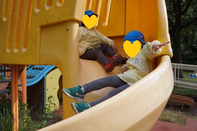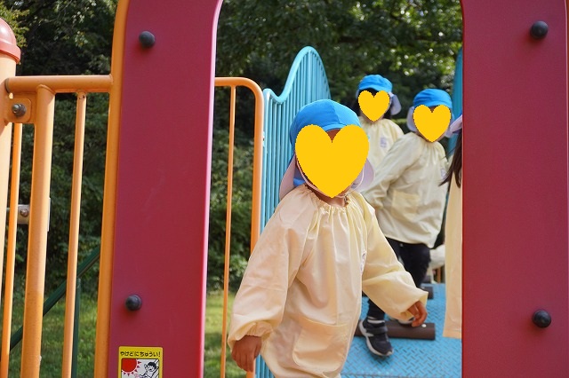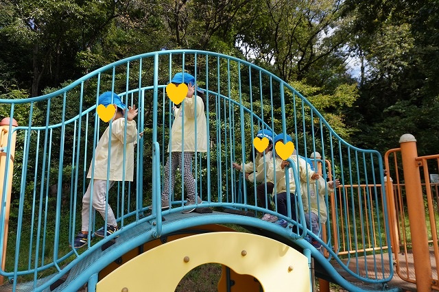 アスレチックにみんなで登り、滑り台を滑りました。順番を守って楽しく遊べました。