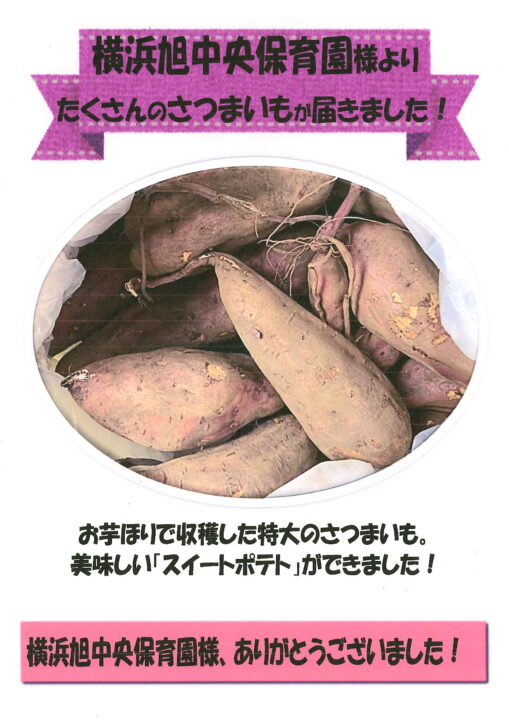 先日のさつま芋掘りで収穫したさつま芋の一部を今宿地域ケアプラザの子ども食堂 らんらん食堂様へ寄付しました。らんらん食堂様がInstagramで横浜あさひ中央保育園を紹介してくださいました。