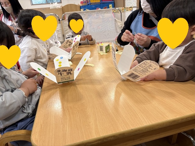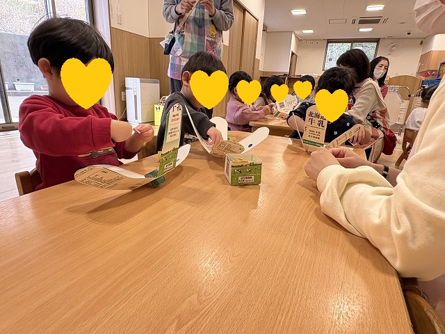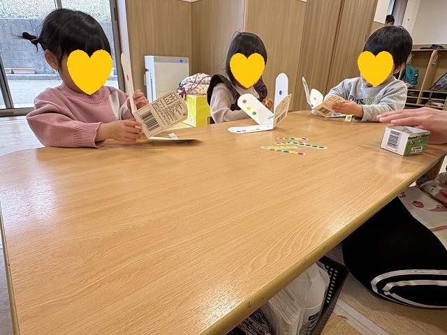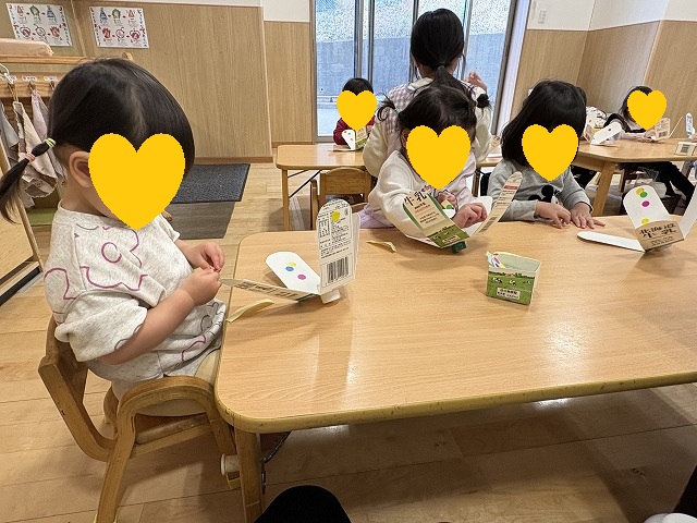 牛乳パックに好きなシールをぺたぺた貼っていきます。台紙からシールをはがすこともじょうずになりました。
