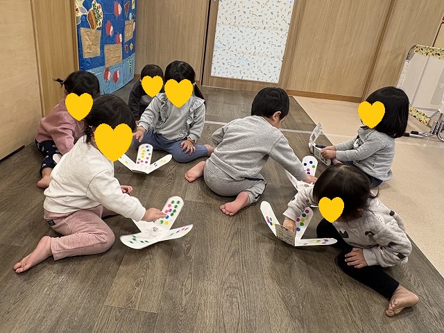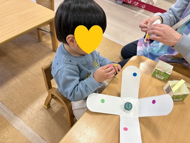 1歳児クラスでお正月にちなんでこまづくりをしました。
