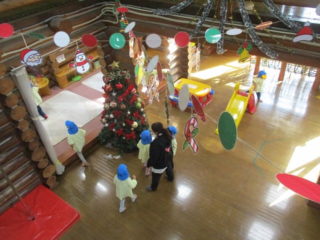 ログハウスの中に大きなクリスマスツリーがあって、とっても素敵でした。