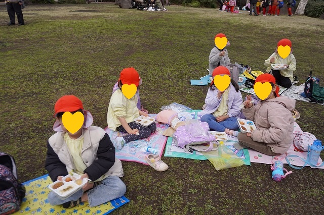 お昼は保育園から持ってきたお弁当です。好きなものが入っていてみんなパクパク食べました。