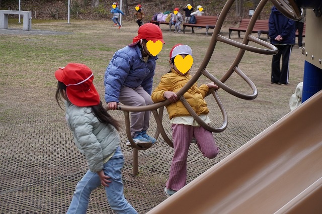 出口の近くの広場で氷鬼をしたり、アスレチックで遊んだりたくさん体を動かしました。